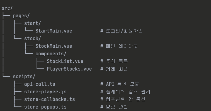 - 트랜잭션 후 상태 동기화: 주식 매매 성공 시 서버에서 다시 정보를 불러오는 await getPlayerInfo()를 실행한다. 이는 클라이언트의 데이터와 서버의 DB 상태를 일치시키는 핵심 프로세스다. 이후 입력 폼을 초기화하여 다음 거래를 준비한다.