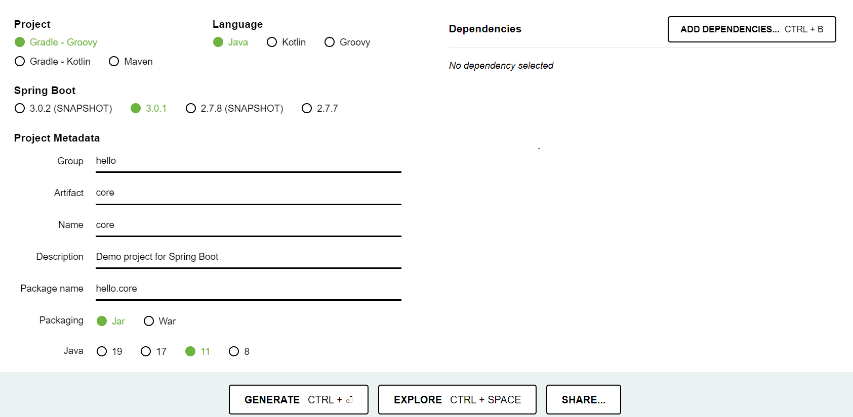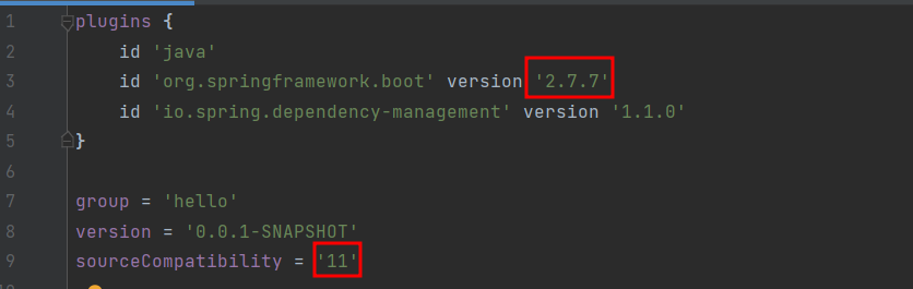 스프링 버전을 3.0.1이 아닌 2.7.7으로 설정, 자바 11로 바꿔서 다시 build 시켜준다.