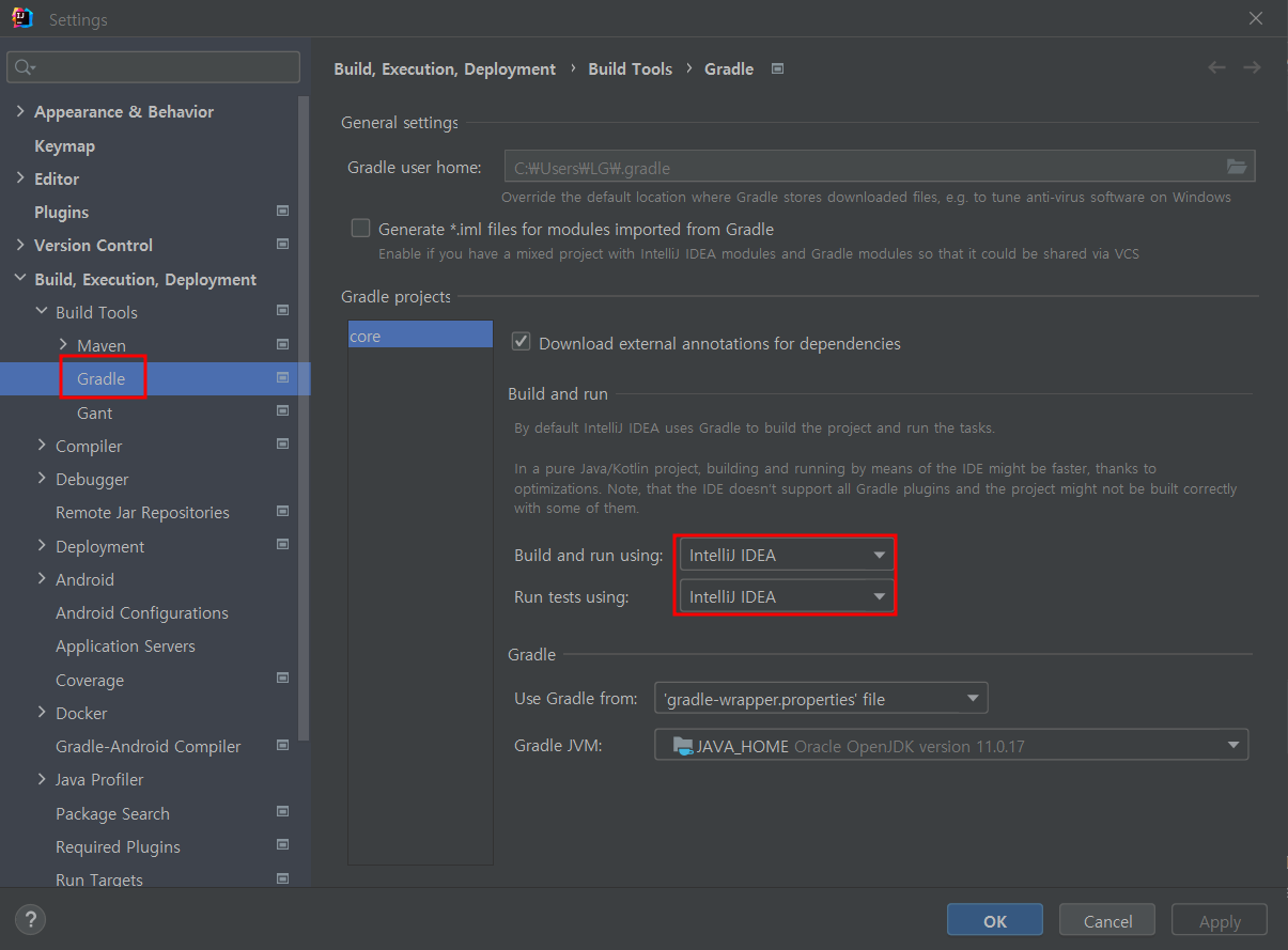 File - Settings - gradle에서 IntelliJ IDEA로 바꿔준다.