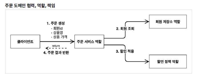 주문 생성 요청이 오면, 회원 정보를 조회하고, 할인 정책을 적용한 다음 주문 객체를 생성해서 반환한다.