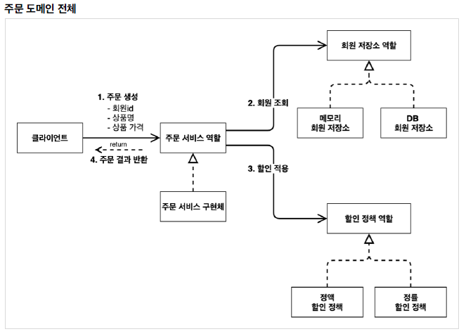 3.할인 적용: 주문 서비스는 회원 등급에 따른 할인 여부를 할인 정책에 위임한다.