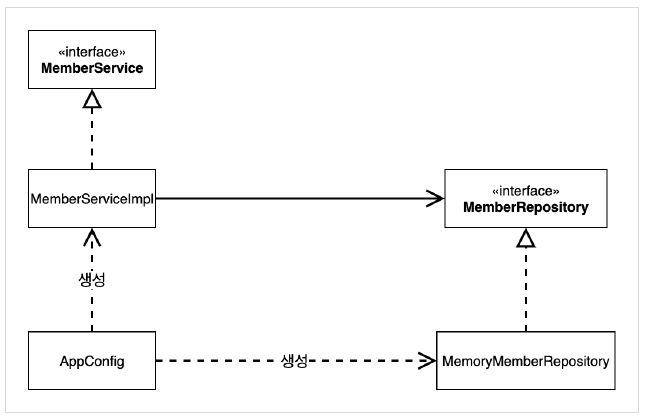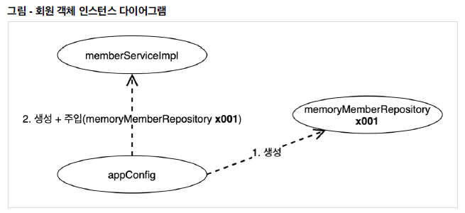 - appConfig 객체는 memoryMemberRepository 객체를 생성하고 그 참조값을 memberServiceImpl 을 생성하면서 생성자로 전달한다.