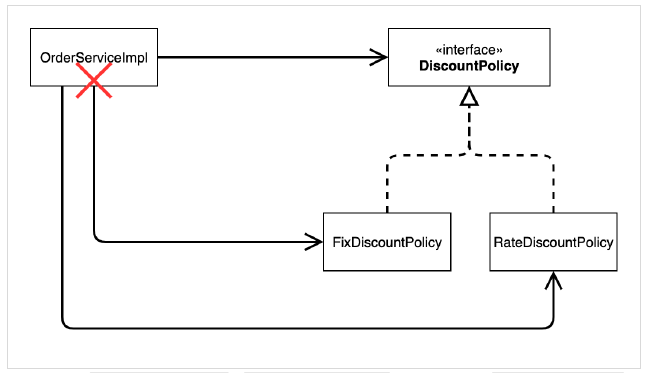 - 클라이언트 코드인 OrderServiceImpl 은 DiscountPolicy 의 인터페이스 뿐만 아니라 구체 클래스도 함께 의존한다.