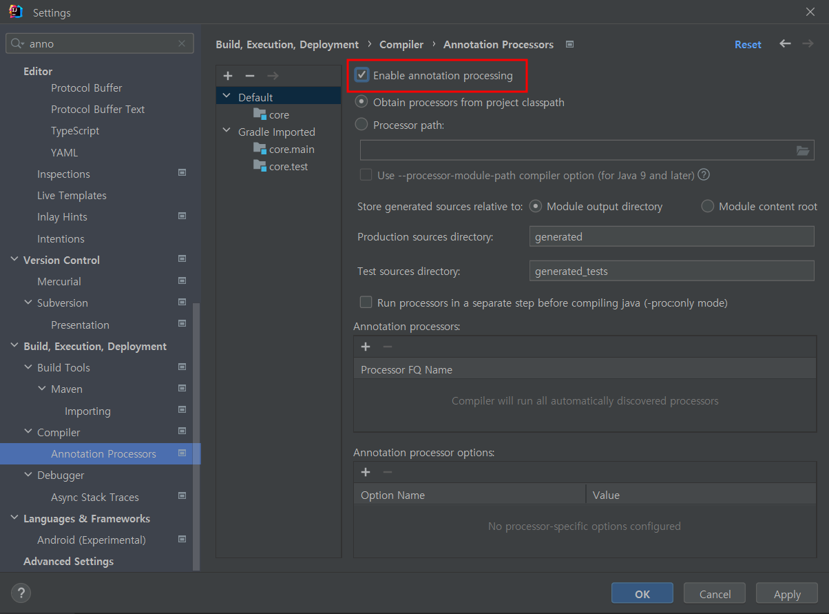 Preferences - Annotation Processors 검색 - Enable annotation processing 체크 (재시작)