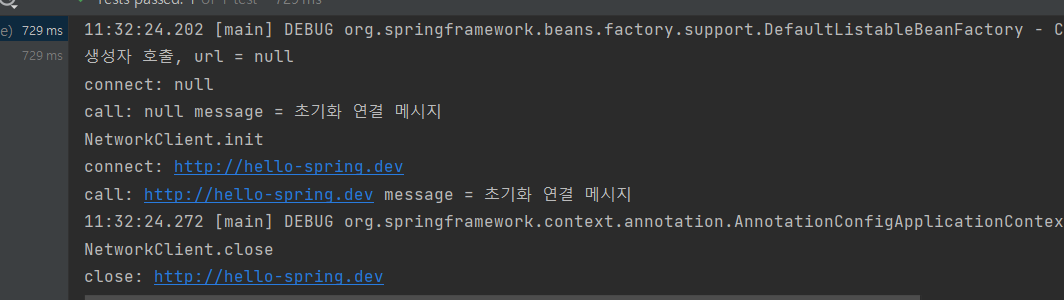- 그리고 스프링 컨테이너의 종료가 호출되자 소멸 메서드가 호출 된 것도 확인할 수 있다.