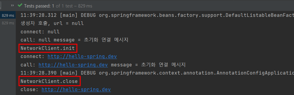 - 출력 결과를 보면 초기화 메서드가 주입 완료 후에 적절하게 호출 된 것을 확인할 수 있다.