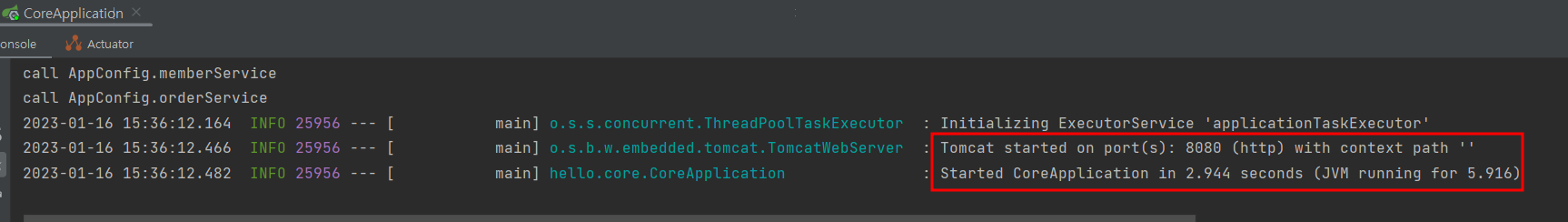 이제 hello.core.CoreApplication 의 main 메서드를 실행하면 웹 애플리케이션이 실행되는 것을 확인할 수