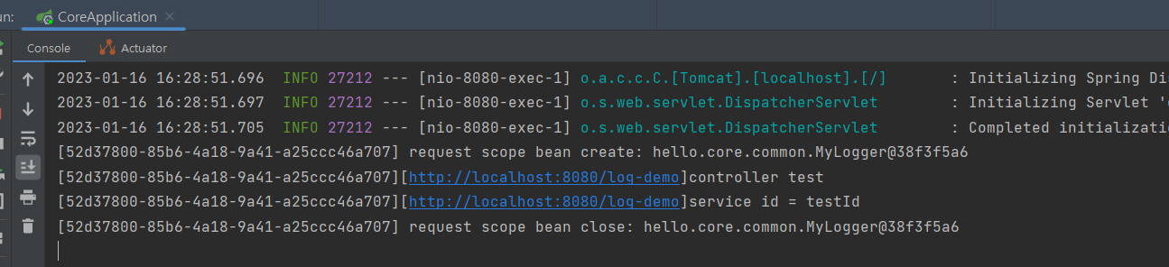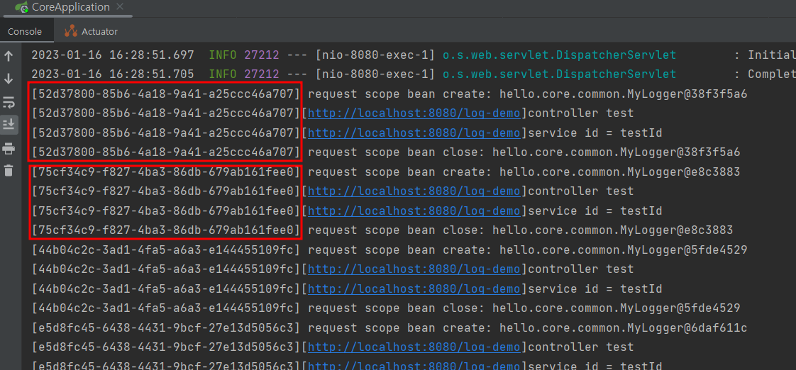 - 이 빈이 생성되는 시점에 자동으로 @PostConstruct 초기화 메서드를 사용해서 uuid를 생성해서 저장해둔다. 이 빈은 HTTP 요청 당 하나씩 생성되므로, uuid를 저장해두면 다른 HTTP 요청과 구분할 수 있다.