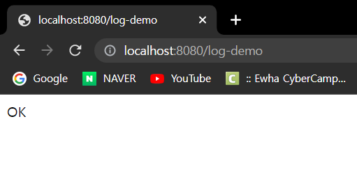 main() 메서드로 스프링을 실행하고, 웹 브라우저에 http://localhost:8080/log-demo를 입력하자.