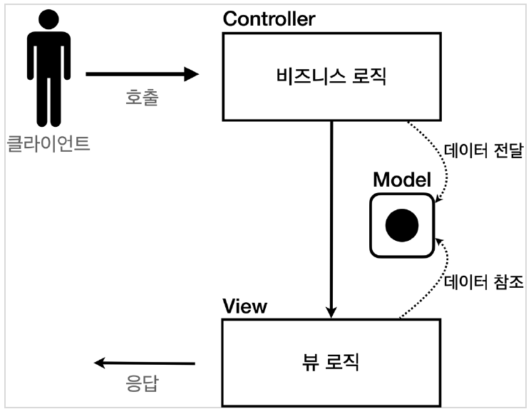모델: 뷰에 출력할 데이터를 담아둔다. 뷰가 필요한 데이터를 모두 모델에 담아서 전달해주는 덕분에 뷰는 비
