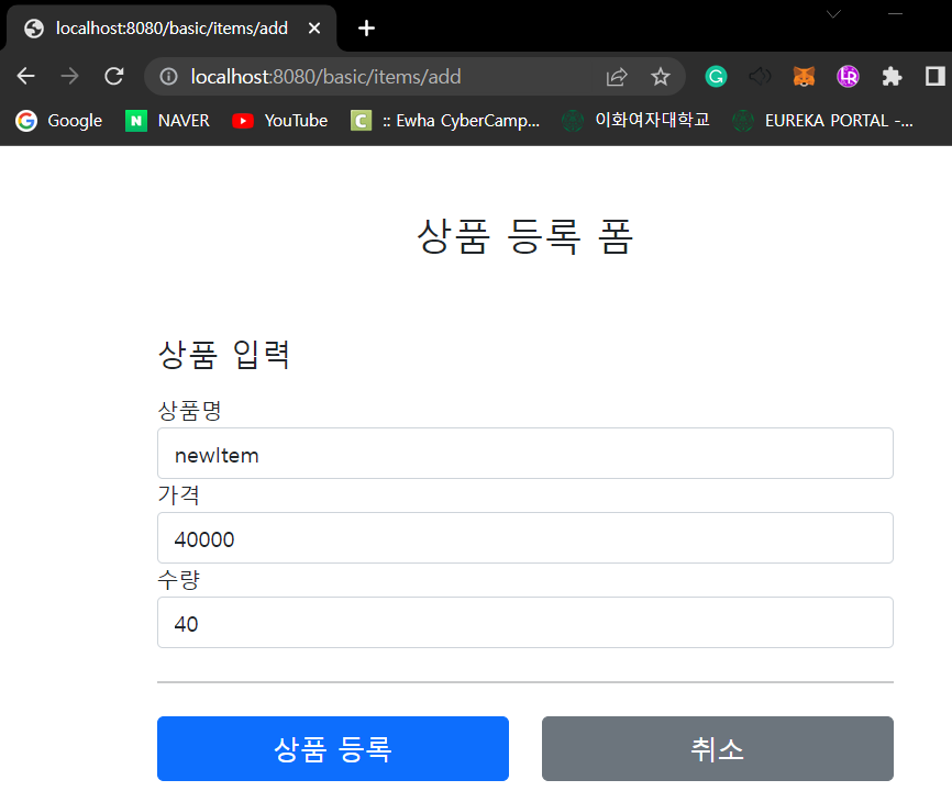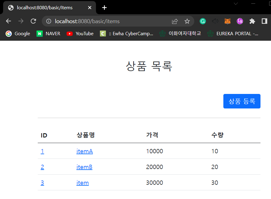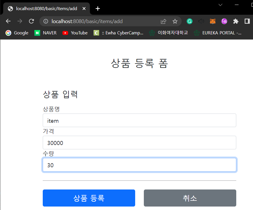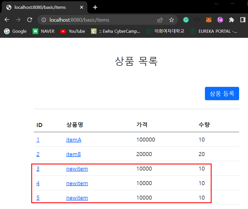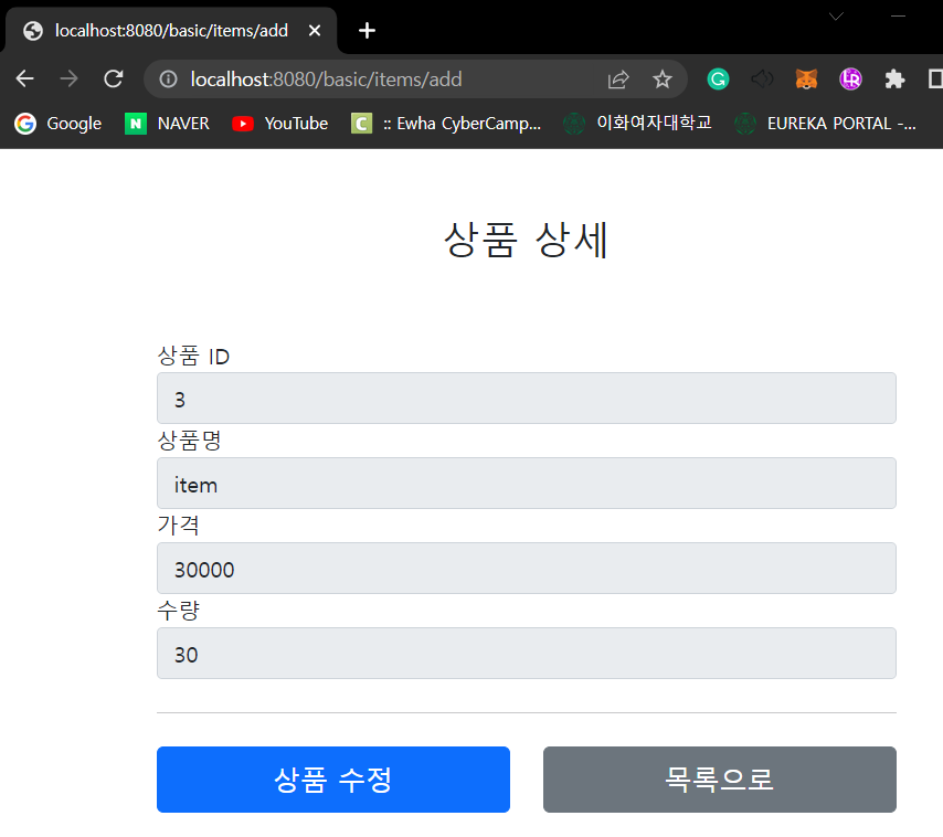 실행전에 이전 버전인 addItemV1 에 @PostMapping("/add") 를 꼭 주석처리 해주어야 한다. 그렇지 않으면 중복 매핑으로 오류가 발생한다.