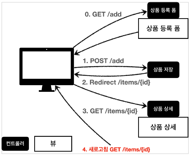 웹 브라우저는 리다이렉트의 영향으로 상품 저장 후에 실제 상품 상세 화면으로 다시 이동한다. 따라서 마지